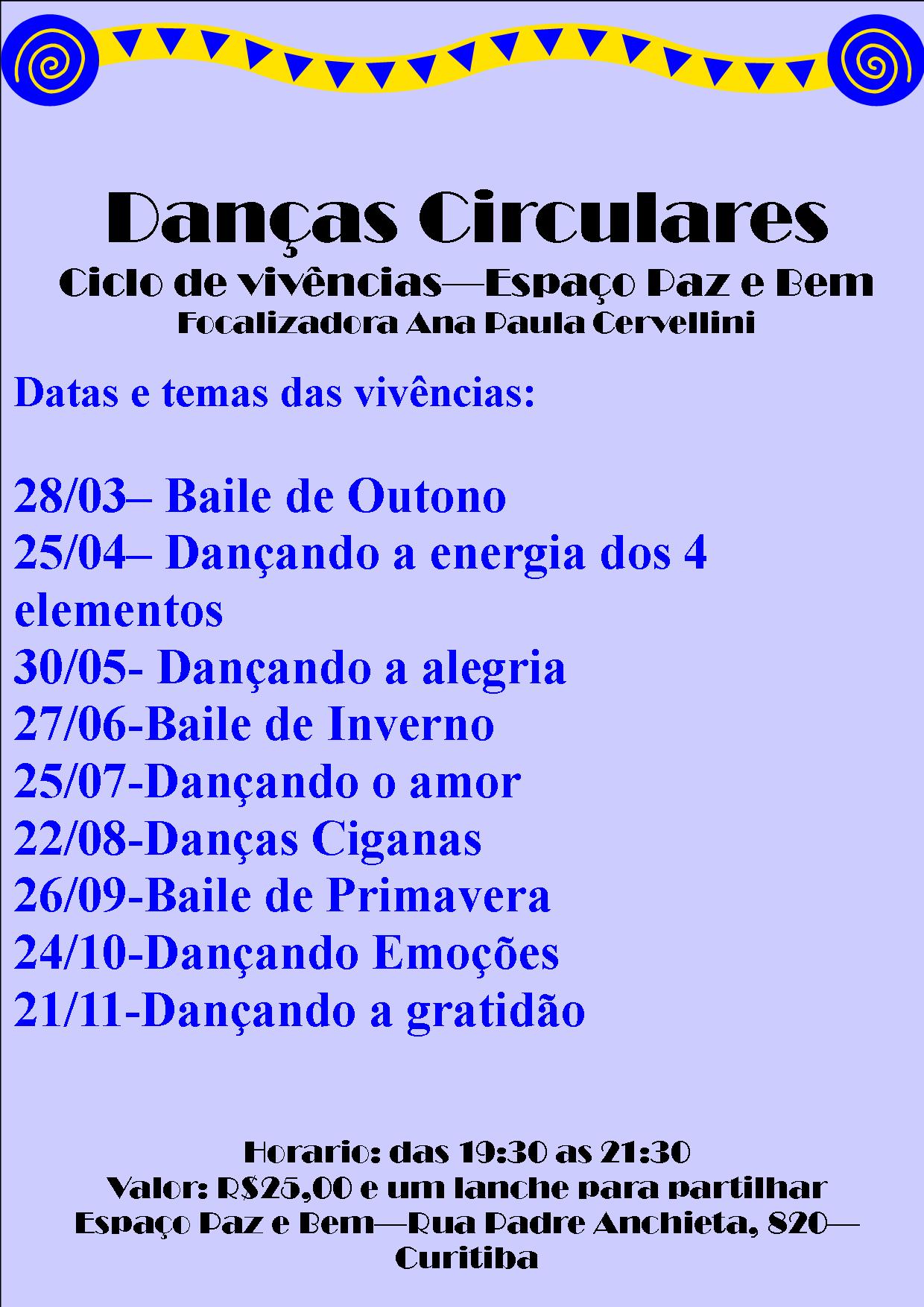 Calendário das vivências de Danças Circulares no Espaço Paz e Bem!